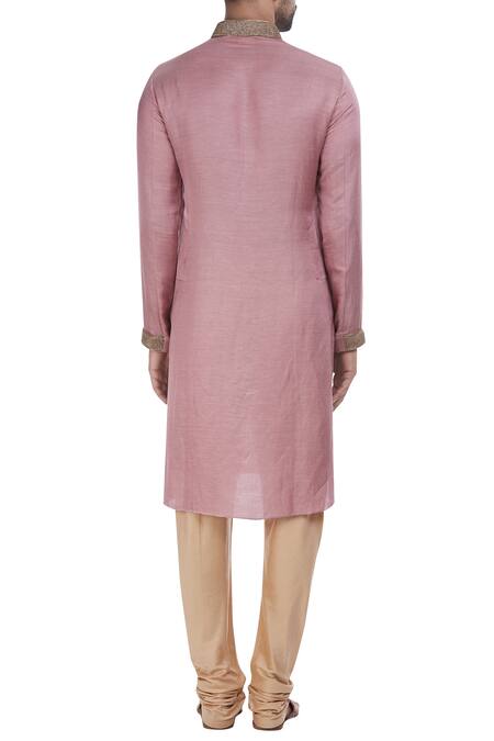 Pink silk kurta with concealed placket & placement embroidery. Comes with contrast churidar.