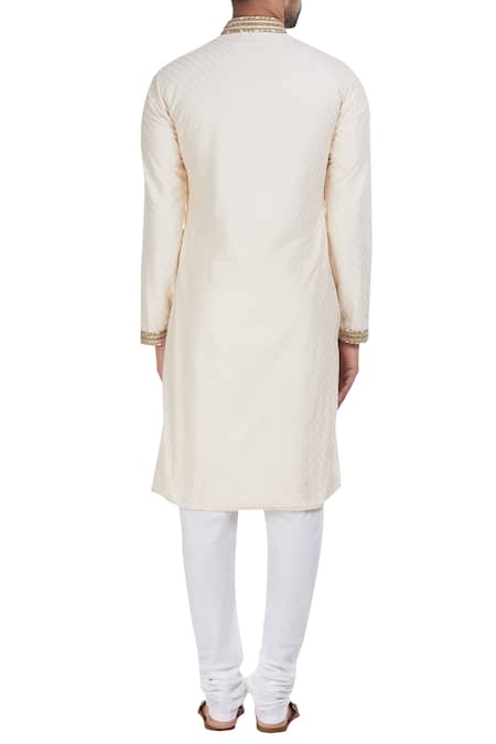 Off white silk kurta with checkered pattern texture & placement embroidery. Comes with churidar.