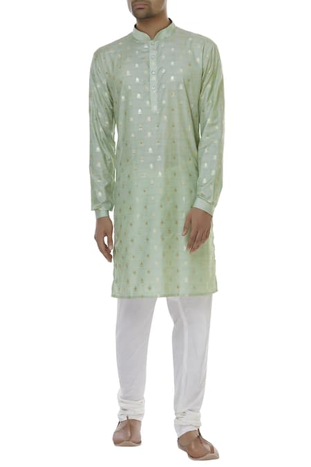 Mint green kurta featuring a leaf motif woven design and a mandarin collar. Paired with a white churidar that has drawstring details.
