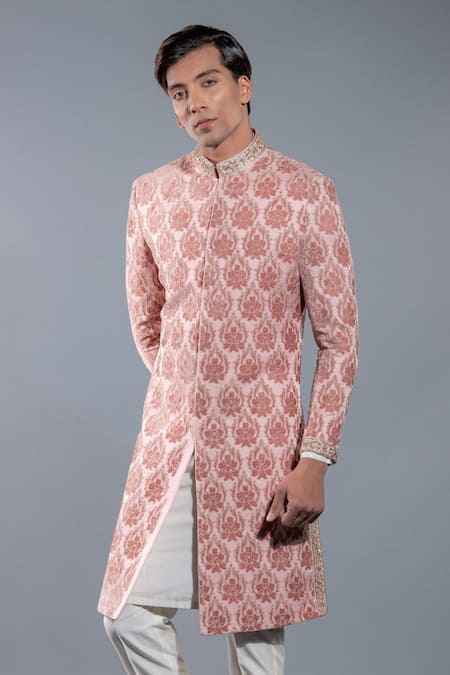 Pink sherwani featuring floral patterns with zari detailing and an embroidered collar. Paired with a plain kurta and pant.