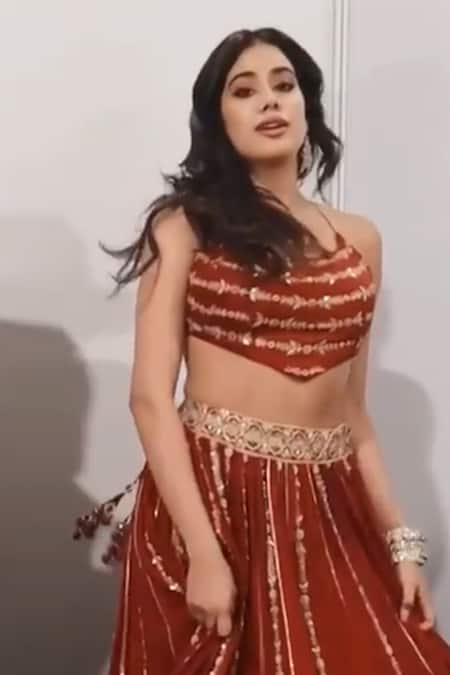 Brick red crushed lehenga with side tassel detail & gota, marodi work embroidered motifs. Paired with back tie-up string blouse & organza silk marodi border dupatta.