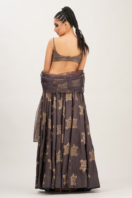 Smoke grey lehenga in silk base with metallic gold hand block prints. Paired with blouse & organza dupatta.