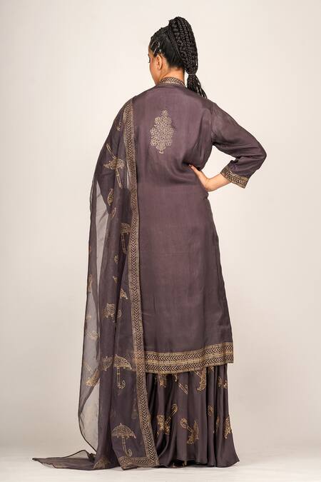 Smocked grey long shirt kurta with gold metallic hand painted block prints in floral motifs. Paired with umbrella print sharara & dupatta.