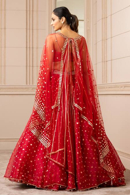 Red asymmetric organza brocade lehenga with an under-layer of chevron borders. Paired with a textured bustier with fringe embellishment. Comes with a sheer cape with square-cut gota embroidery and gota-lined wings extended in the back.