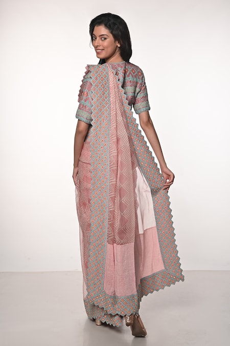 Pink silk organza saree featuring geometric handblock print with a gujrati sindhi embroidered border. Paired with an embroidered blouse adorned with mirrorwork embellishments.