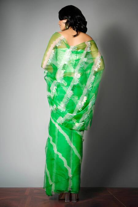 Green saree highlighted with linear tie-dye print and intricate hand embroidery. Comes with unstitched blouse fabric.