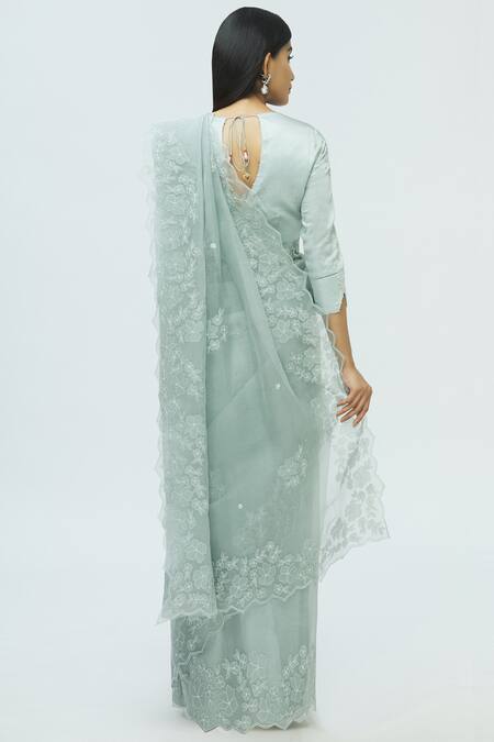 Grey silk organza saree with floral embroidered motifs & sequin embellishment. Comes with silk blouse & petticoat.