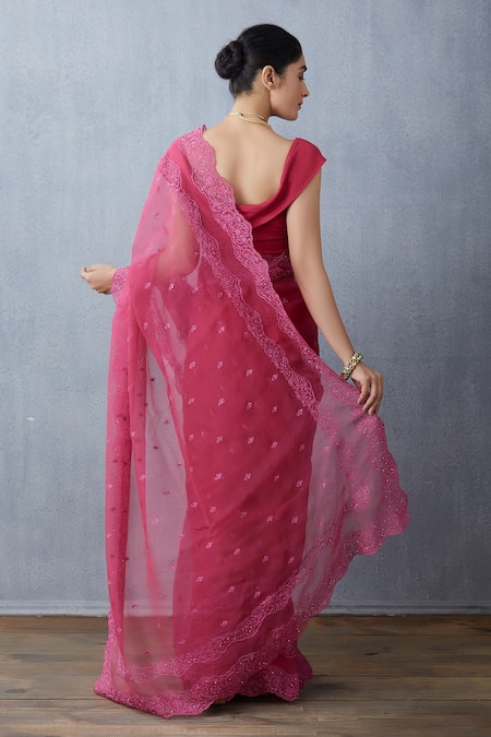 Scarlet red tinted pink saree with all-over floral motif thread work, sequin embellishments & scallop border.