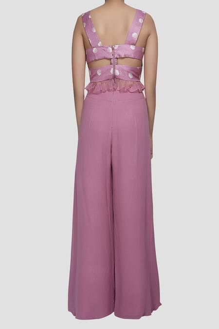 Pink high-waist pant with flared hem. Comes with top and pre-draped dupatta.
