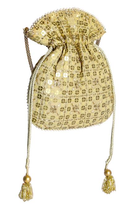 Gold potli bag with all over sequin embellishment & bead detailed border.