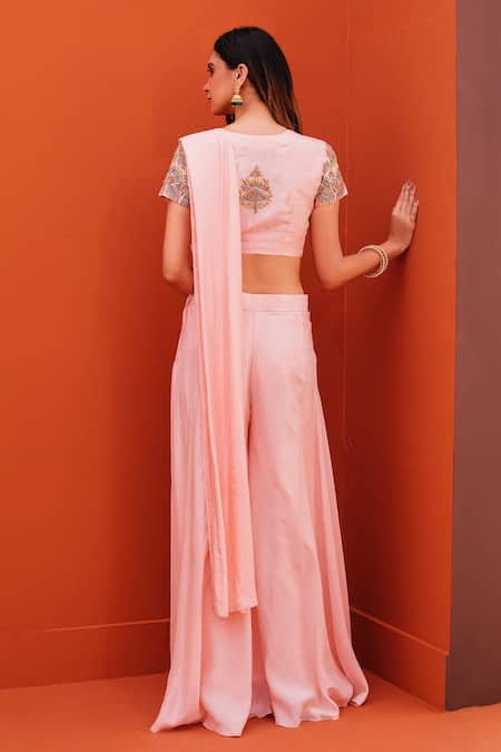 Baby pink pre-draped pant saree featuring floral embroidery and an attached embroidered palla. Paired with an embroidered blouse with a round neckline and short sleeves.