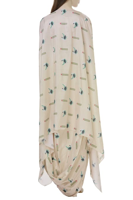 Cream tinted beige hued bird motif print cowl draped skirt paired with matching bustier & asymmetric hemline cape.
