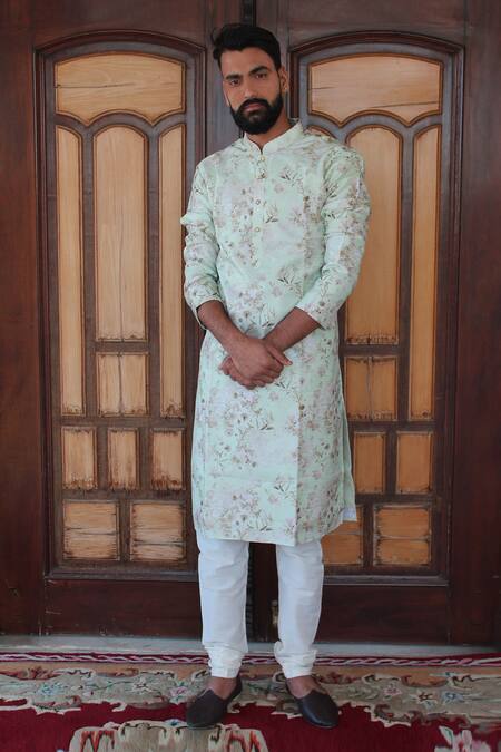 Sage green kurta with floral printed motifs & front button placket. Paired with churidar.