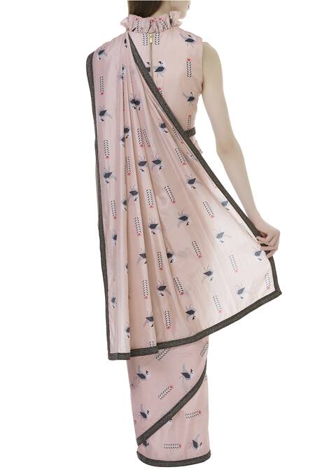 Pastel peach overall sparrow motif print detailed saree with embroidered border. Comes with matching blouse & petticoat.