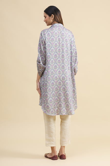 Blue Silk Spread Collar Printed Tunic
