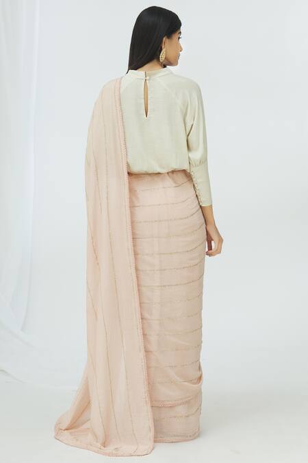 Pink saree with gold moss stripes & lace trim border. Comes with off white blouse.