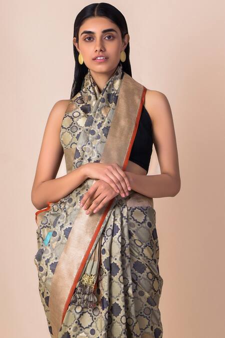 Grey silk saree with motifs all over. Comes with running blouse fabric.