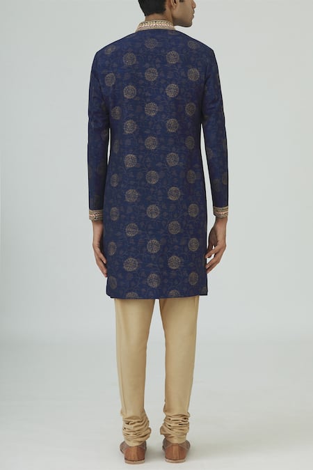 Blue sherwani with all-over floral motif prints. Comes with gold churidar.