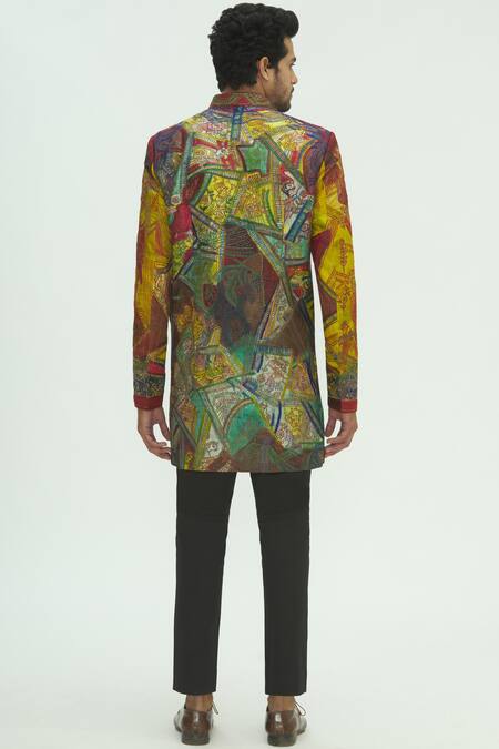Maroon sherwani with embroidered abstract motifs all over. Paired with pants.
