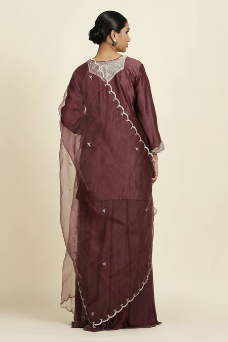 Purple silk kurta featuring notch neckline with thread and sequin embroidery. Paired with a high waist sharara in chiffon and a silk organza dupatta with scallop border.