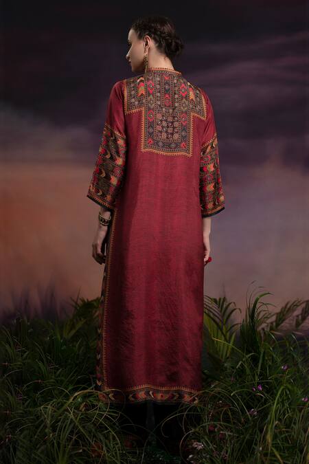 Vermillion panelled tunic with geometric printed motifs, front button placket & mirror work embroidered detail.