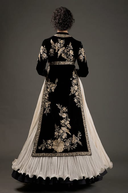 Black silk velvet split anarkali with resham thread and hand embroidery work with attached crinkled ghera. Paired with plain net dupatta & churidar.