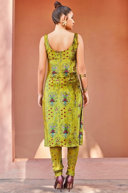 Lime green kurta with all over floral & baroque print motif. Comes with churidar.