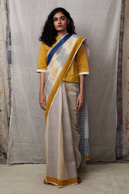 Blue Cotton Printed Stripe Saree
