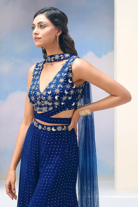Navy blue blouse featuring a V neck, sleeveless design, and criss-cross front with back bow tie-up. Paired with palazzo pants showcasing all-over badla embroidery and a choker dupatta with stars and moon embroidered panel.