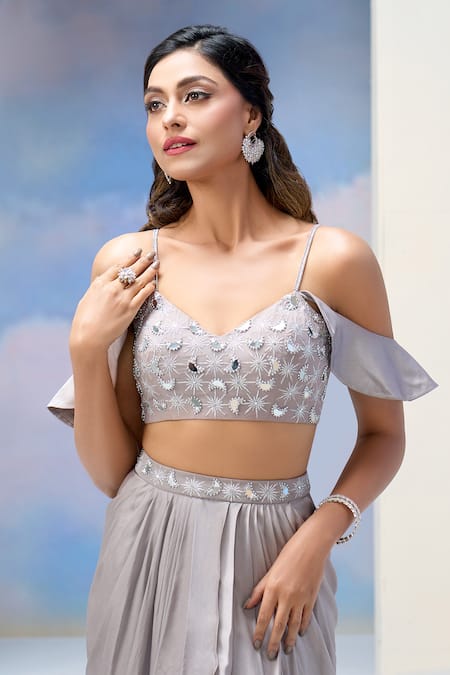 Grey blouse featuring sweetheart neckline and cold shoulder sleeves, adorned with moon and stars embroidery. Paired with a draped skirt in satin georgette.