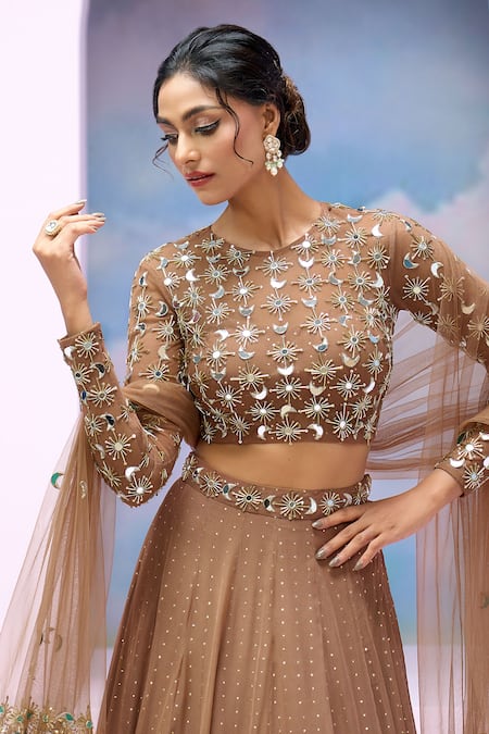 Brown blouse featuring mirror, sequins, and nalki embroidery. Paired with a tiered lehenga and dupatta made from net and georgette fabrics.