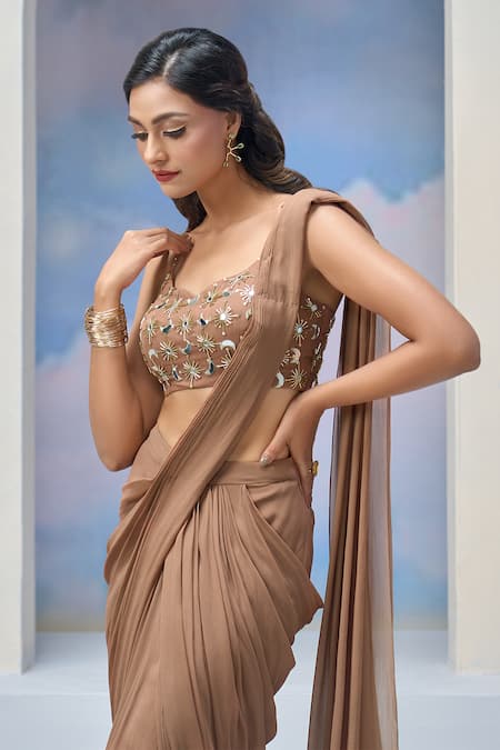Brown pre-draped saree paired with a sleeveless embroidered blouse featuring moon and star motifs. The saree is crafted from georgette and shantoon fabrics, ensuring a comfortable fit.