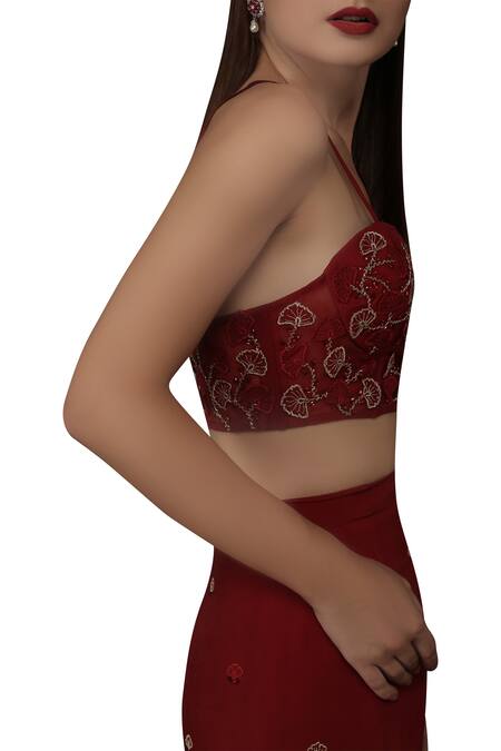 Buy_Silky Bindra_Red Organza, Crepe, Shantoon Floral Motifs Embroidered Lehenga Set_at_Aza_Fashions