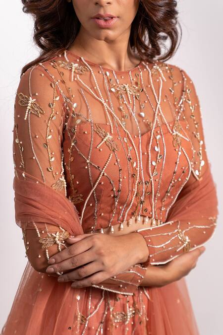 Dusty pink lehenga with pearl, sequin and cutdana embroidery. Comes with embroidered full sleeves blouse and sheer dupatta.