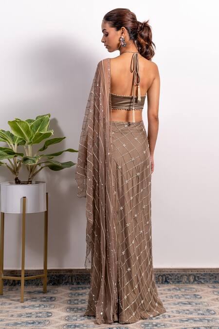 Mouse brown pre-draped saree with embroidery in a checkered pattern and high slit on the side. Comes with halter neck blouse.