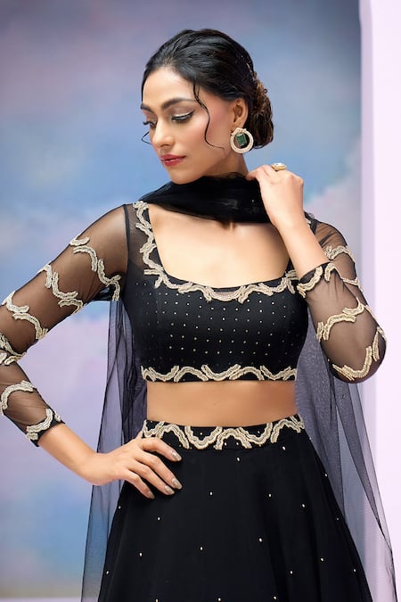 Black lehenga featuring cloud patch beaded and sequin embroidery. Paired with an embroidered blouse and dupatta with semi-sheer sleeves.