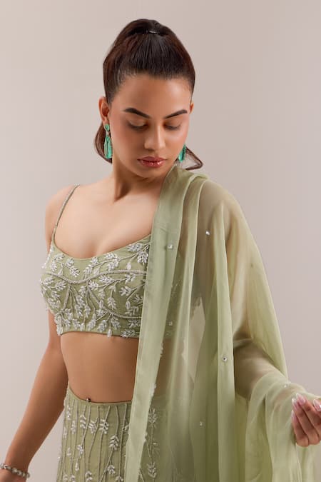 Green lehenga featuring crystal and bead floral vine motifs. Paired with a padded blouse and dupatta, both embellished with beads and crystals.