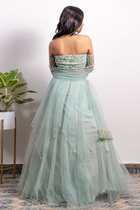 Mint green lehenga with attached cancan, bead drops on the top layer and embroidered waistband. Comes with off shoulder blouse and sheer dupatta.
