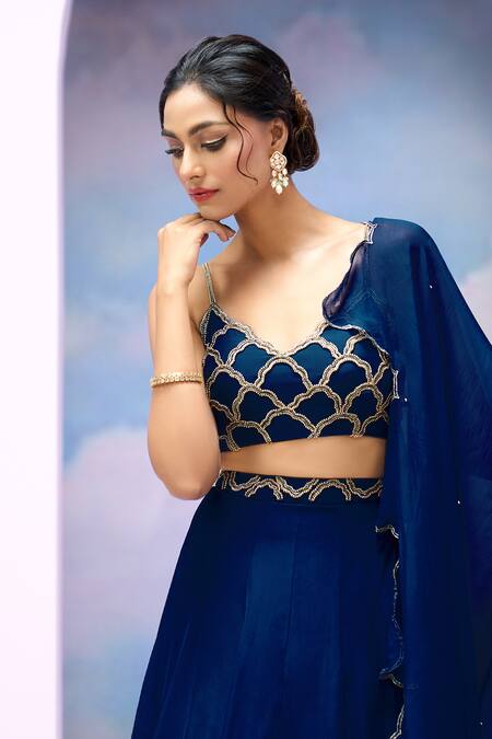 Navy blue lehenga featuring an embroidered waistband and scalloped V neckline blouse. Accompanied by a cutwork dupatta with bead embellishments.