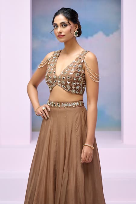 Brown lehenga set featuring a V-neck blouse with sequins, mirror, and nalki embroidery. Paired with an embroidered waistband lehenga and a coordinating dupatta.