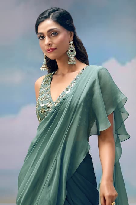 Blue Organza, Silk, Chiffon Stella Pre-draped Ruffle Saree With Blouse