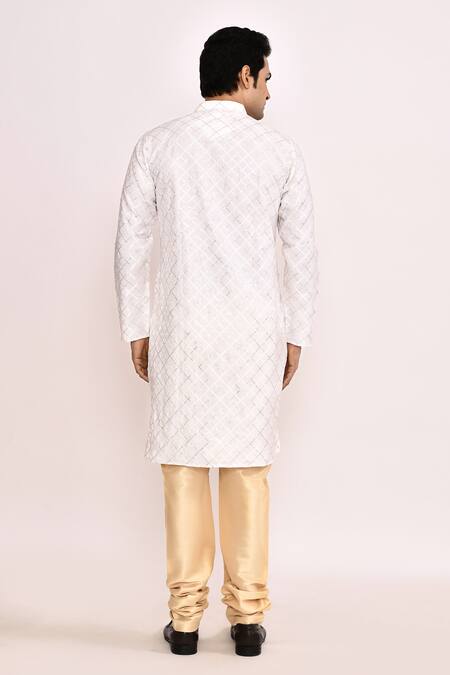 White silk blend long kurta featuring a diamond pattern with a button placket
