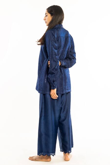 Blue shirt with sequin embroidery in stripes & cuff sleeves.
