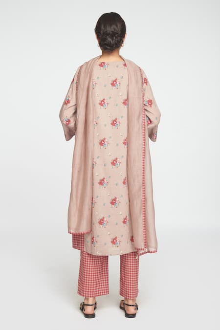 Beige floral printed kurta featuring a V-neckline and elbow-length sleeves. Paired with checkered pants and a soft Chanderi dupatta.