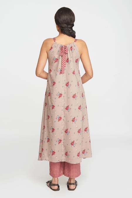 Back tie-up detail with checkered ribbon, Floral print design throughout, Attached lining for comfort