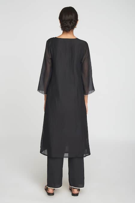 Black Chanderi, Cotton Embroidery V-neck Kurta Set