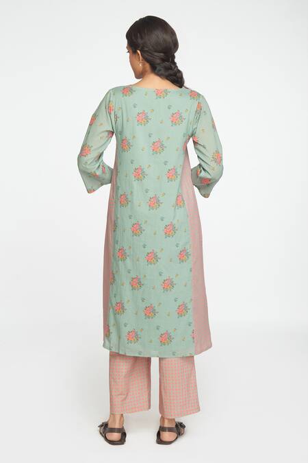Dull teal kurta featuring floral prints and a V-neckline. Paired with checkered pants and a soft Chanderi dupatta.
