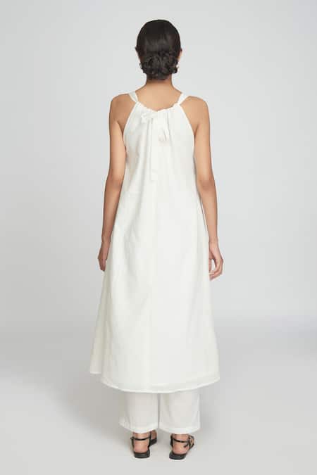 White cotton kurta featuring floral embroidery and a V neckline. Paired with matching cotton pants and an attached lining.