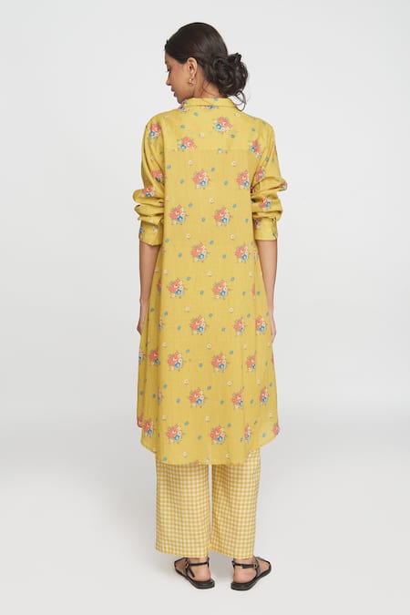 Yellow floral printed kurta featuring a straight silhouette and a collared neckline. Paired with matching elastic waist pants in a checkered pattern.
