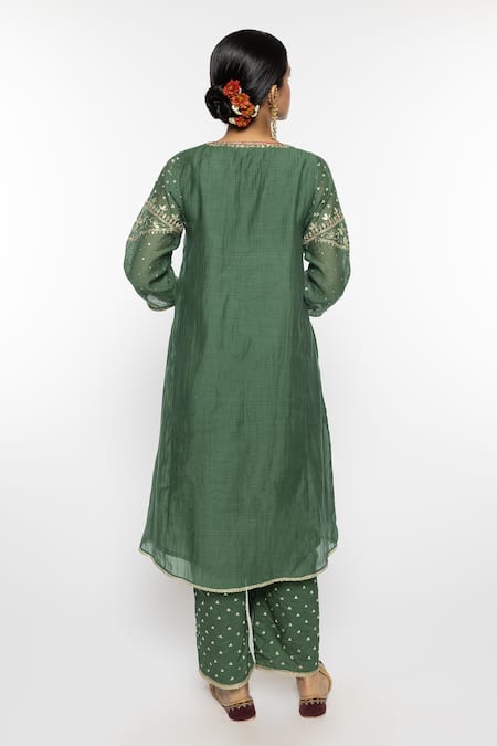 Green Chanderi, Cotton, Silk, Kota Doria Embroidery Hand A-line Kurta Pant Set